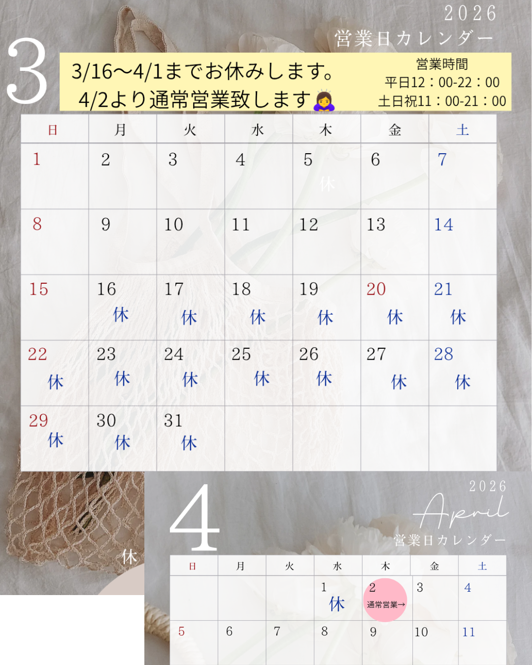 3月の営業 未分類 2026.02.28 SNS Follow あっという間に3月ですね 少し花粉症で目と鼻が辛いですが、今年も乗り越えようと思います↗ 3月は16日〜4/1 まで少しお休みします。 今回のお休み期間中(3/16〜4/1)はLINE・メール・お問い合わせフォームのみのご対応になります。(ホットペッパービューティーからのご予約も承っております。) お休み期間中📞電話・ショートメールはご対応出来かねます事をご了承下さいませ🙇♀️ お手数おかけしますがどうぞ宜しくお願い致します。 3月・4月のご予約お待ちしております🙂↕️ さとじゅり