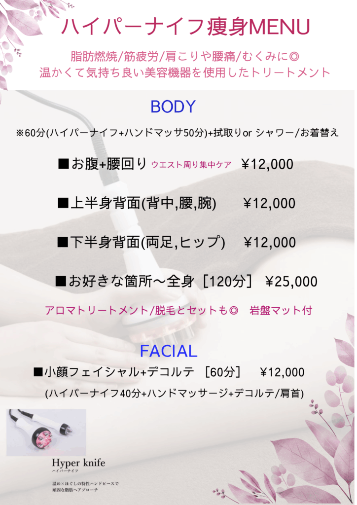 個人サロンという特徴を活かして、ハイパーナイフをまんべんなくかけて身体がスッキリした!と実感していただけるようなコースを取り入れてみました。