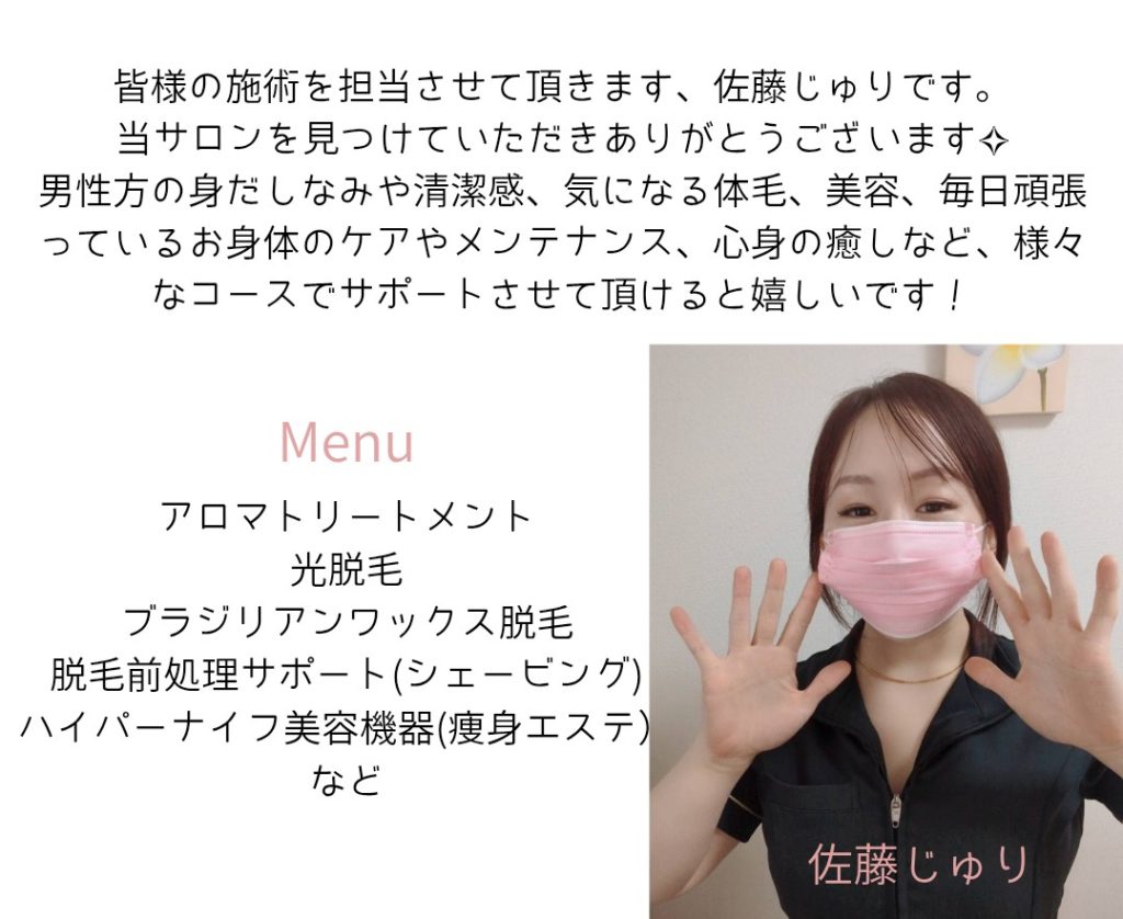 | メニュー内容:アロマトリートメント / ブラジリアンワックス脱毛 / 光脱毛 (シェービング込) /脱毛前処理(BODYシェービング) / アフターケア / ハイパーナイフ (痩身美容機器を使用したトリートメント) |